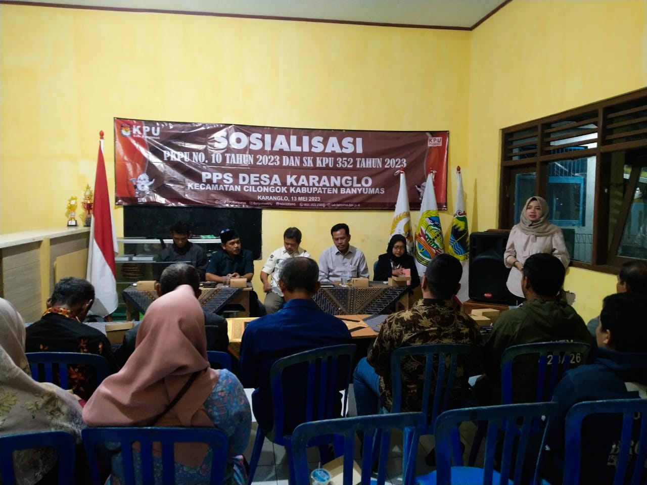 CILONGOK,BAWASLU BANYUMAS-Panitia Pemungutan Suara (PPS) Desa Karanglo, Kecamatan Cilongok Sosialisasi PKPU No.10 Tahun 2023 dan SK KPU No.352 Tahun 2023 di Gedung Sekretariat BPD Desa Karanglo Sabtu, 13 Mei 2023 pukul 20.45 WIB.