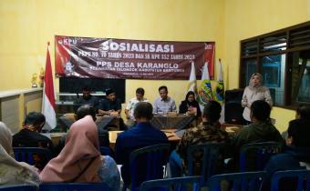 CILONGOK,BAWASLU BANYUMAS-Panitia Pemungutan Suara (PPS) Desa Karanglo, Kecamatan Cilongok Sosialisasi PKPU No.10 Tahun 2023 dan SK KPU No.352 Tahun 2023 di Gedung Sekretariat BPD Desa Karanglo Sabtu, 13 Mei 2023 pukul 20.45 WIB. Acara dihadiri Kepala Desa yang diwakilkan Kasi Peme